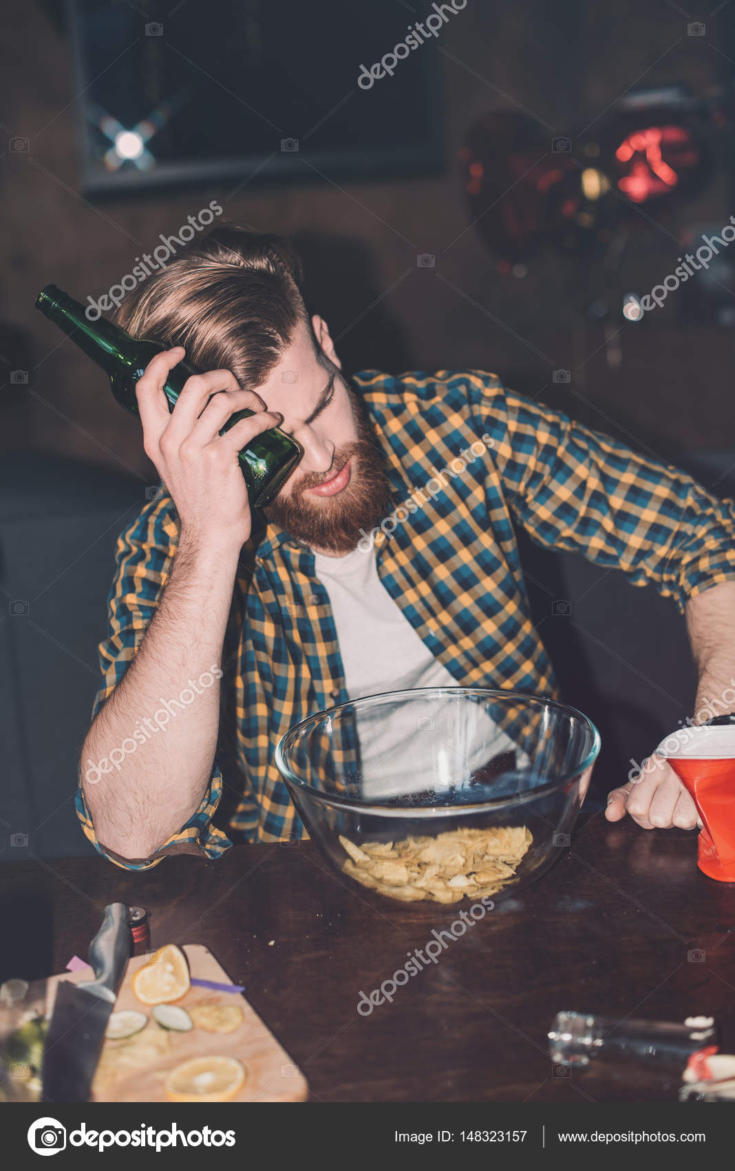 Homem com dor de cabeça segurando cerveja — Fotografia de Stock Grátis
