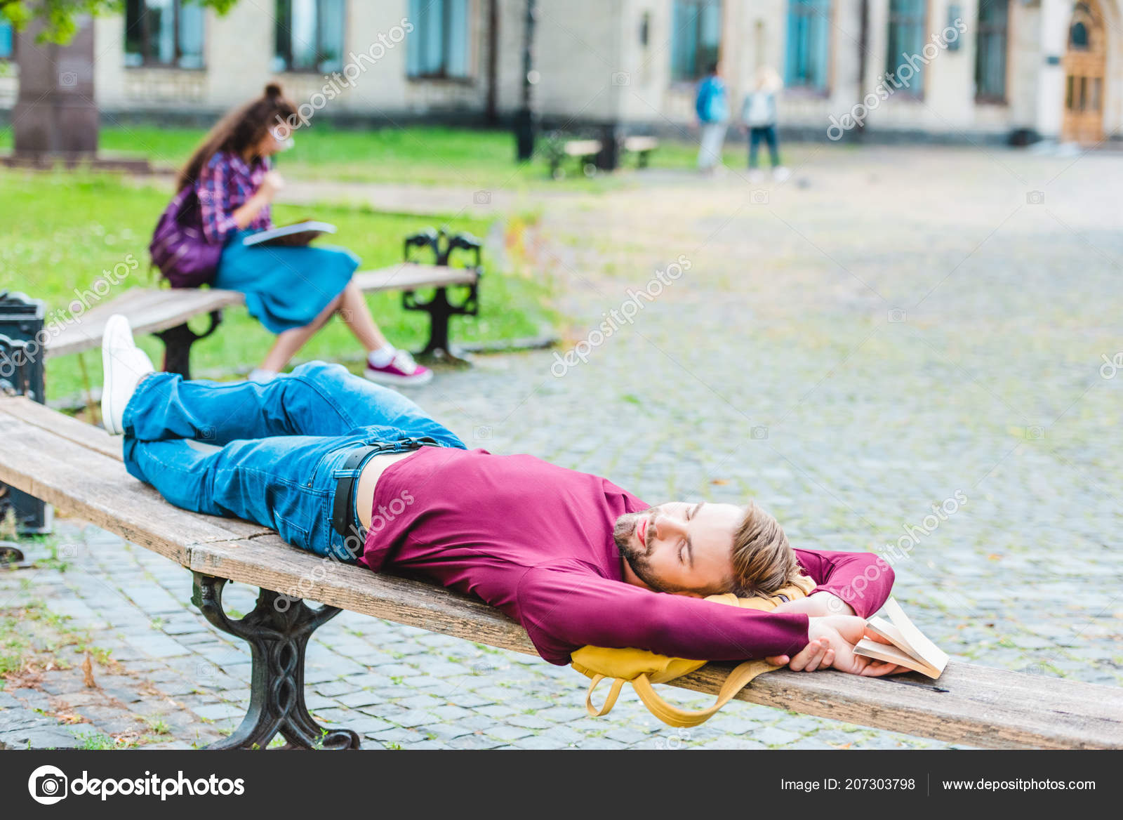 Foco Seletivo Estudante Dormindo Banco Madeira Parque — Fotografia de Stock Grátis