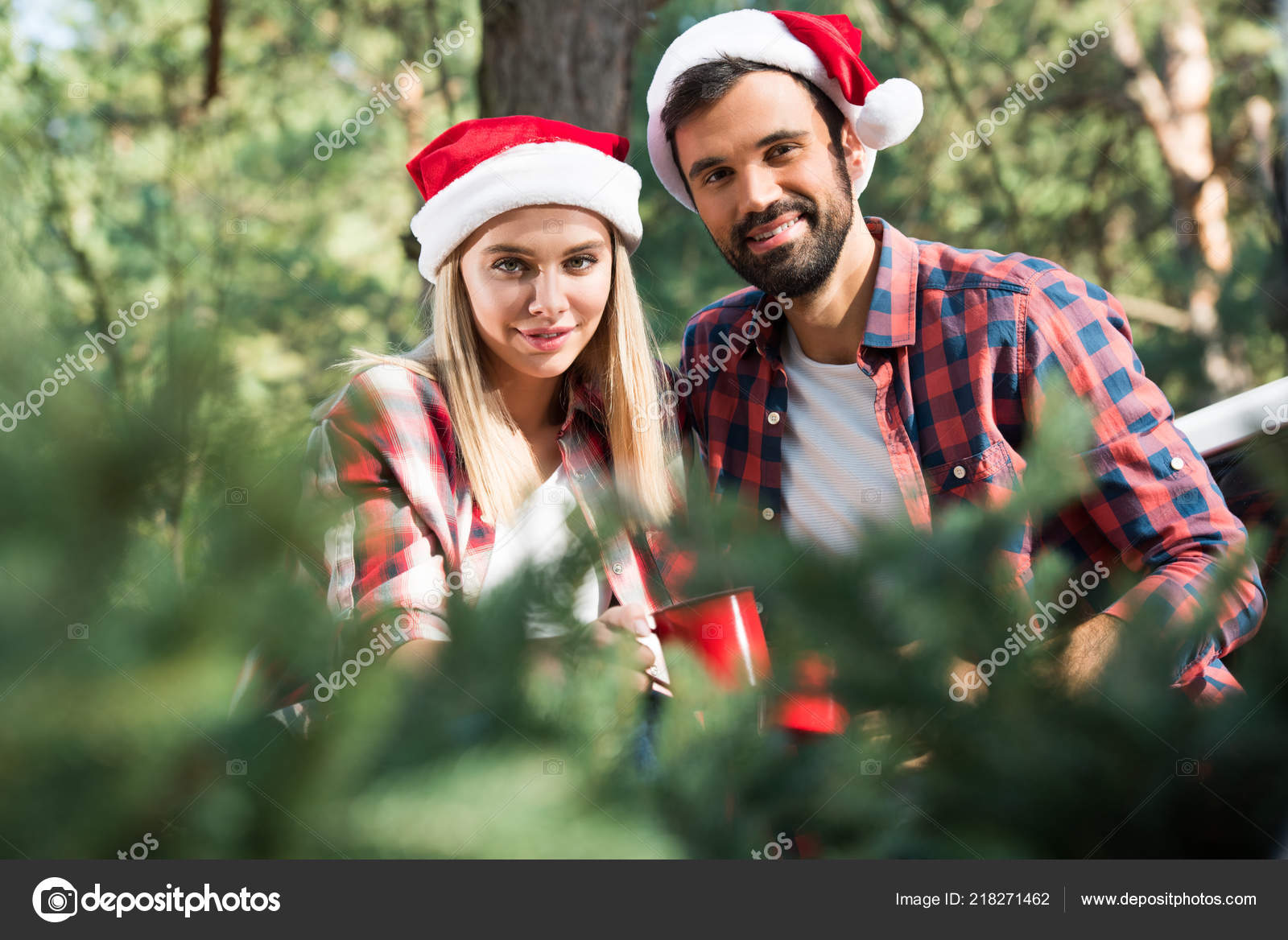 Foco Seletivo Jovem Casal Chapéus Natal Com Copos Olhando Para — Fotografia de Stock Grátis